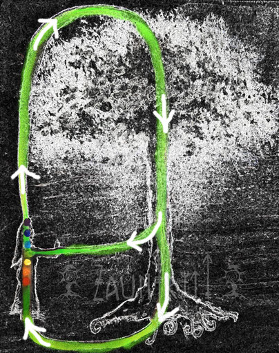 Dann fliesst sie nach oben über den Kopf hinaus und über die Baumkrone durch seinen Stamm, seine Wurzeln und über die Erde in die Fußsohlen wieder in den Körper und nach oben wiederholend.